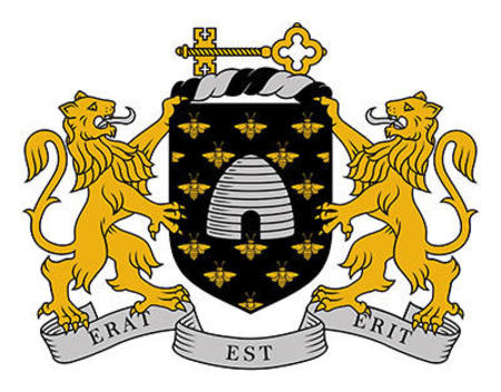 Melnā laukumā augšup lidojošas zelta bites; vairoga vidū sudraba strops. No augšas vairogs apvīts ar melni sudrabotu virvi; virs tā horizontāli novietota zelta atslēga. Vairogu atbalsta divas zelta lauvas ar sudraba mēlēm, tās stāv uz sudraba lentes ar devīzi “ERAT EST ERIT” (“Bija. Ir. Būs”). Ģerbonis tika reģistrēts 2018. gada 4. oktobrī.